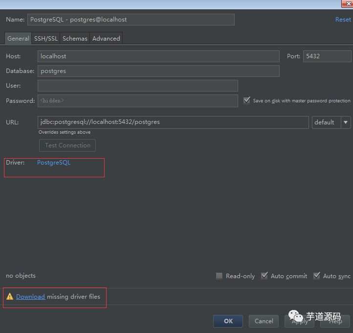 Driver部分显示数据库驱动信息,如果还没有下载过驱动,底部会有个警告,提示缺少驱动