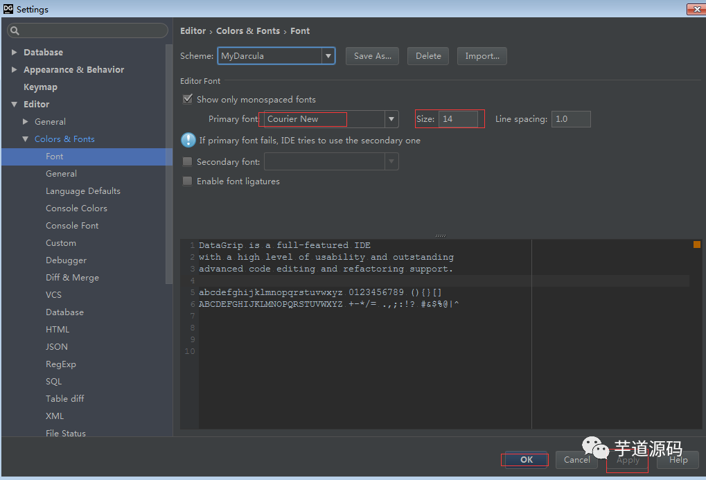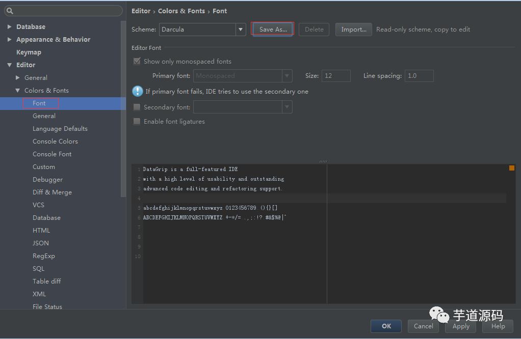 需要将当前主题保存一下,点击save as,起个名,选择重命名后的主题就能修改了,这里我选择习惯的Conurier New字体,大小为14号,点击右下角的apply,点击OK