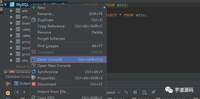 右键选中的数据库连接,选择open console,就可以在右侧的控制台中书写sql语句了。
