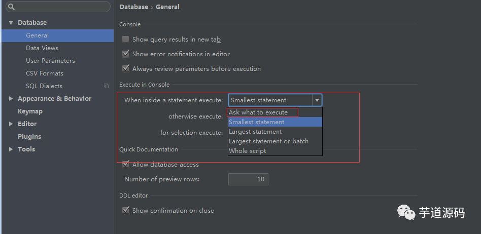 也可以使用快捷键Ctrl+Enter,选中情况下,会直接执行该sql,未选中情况下,如果控制台中有多条sql,会提示你要执行哪条sql。之前习惯了dbvisualizer中的操作,dbvisualizer中光标停留在当前sql上(sql以分号结尾),按下Ctrl+.快捷键会自动执行当前sql,其实DataGrip也能设置,在setting->Database-General中