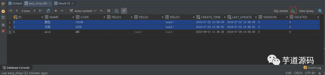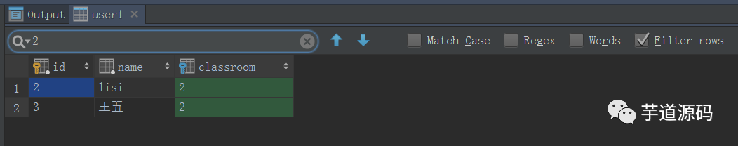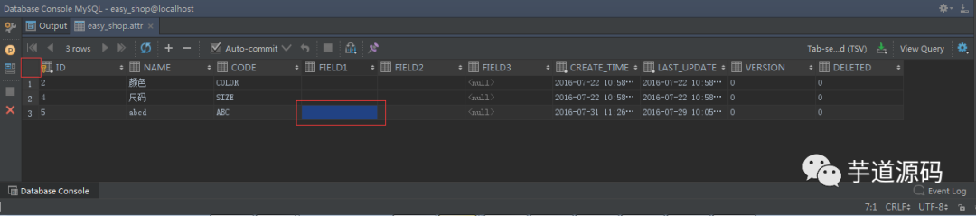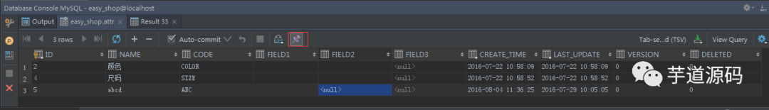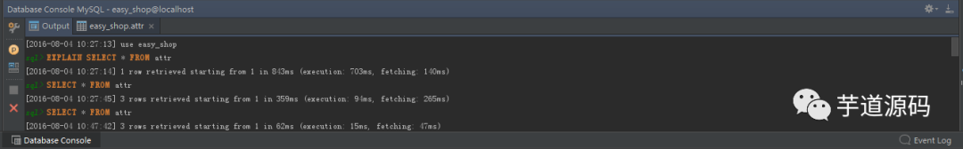 旁边的output控制台显示了执行sql的日志信息,能看到sql执行的时间等信息