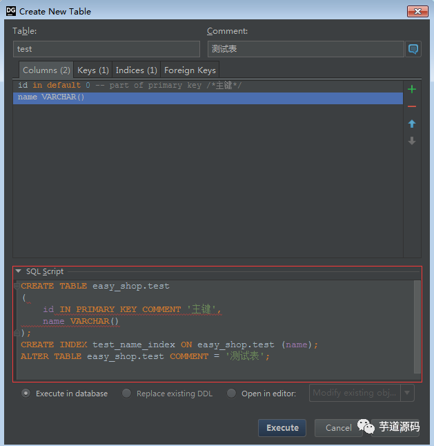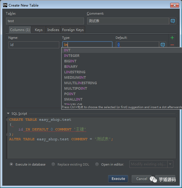 顶部可以填写表名、表注释,中间可以点击右侧绿色+号添加列,列类型type也是能自动补全,default右侧的消息框图标点击后能对列添加注释,旁边的几个tab可以设置索引及外键