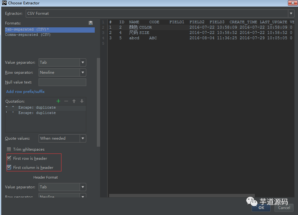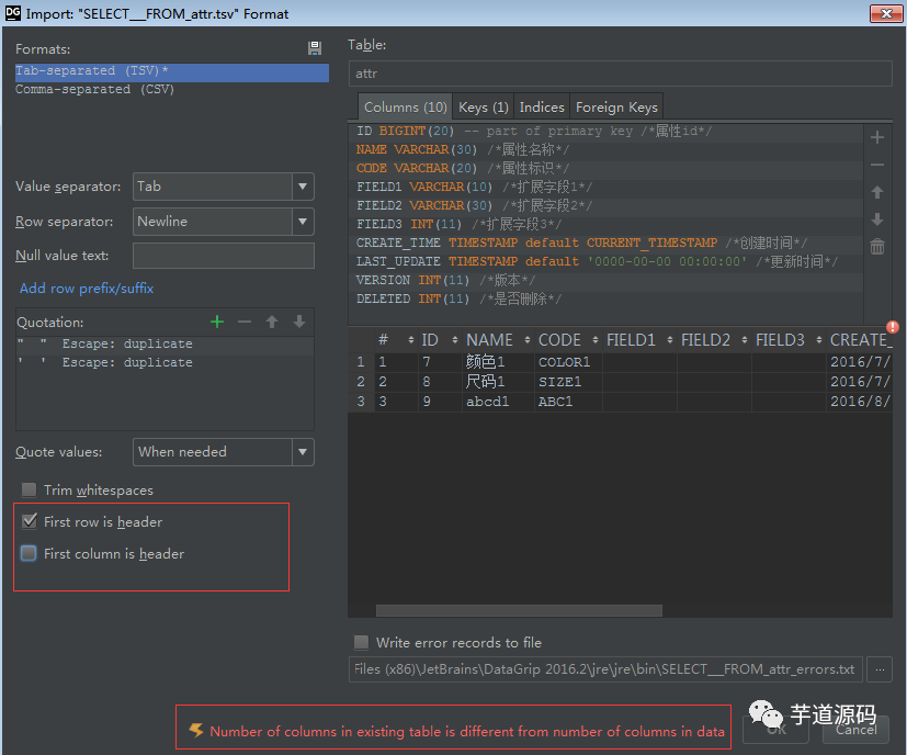注意,导出的时候如果勾选了左侧的两个header选项,导入的时候如果有header,也要勾选,不然会提示列个数不匹配