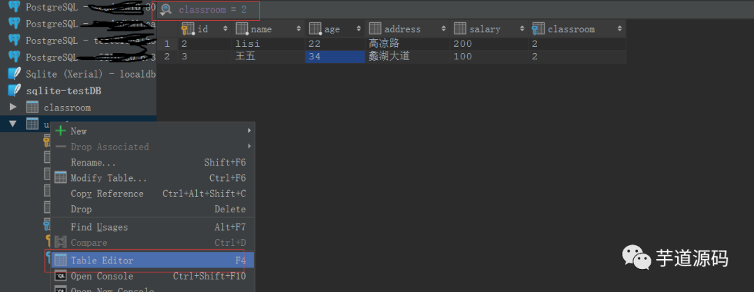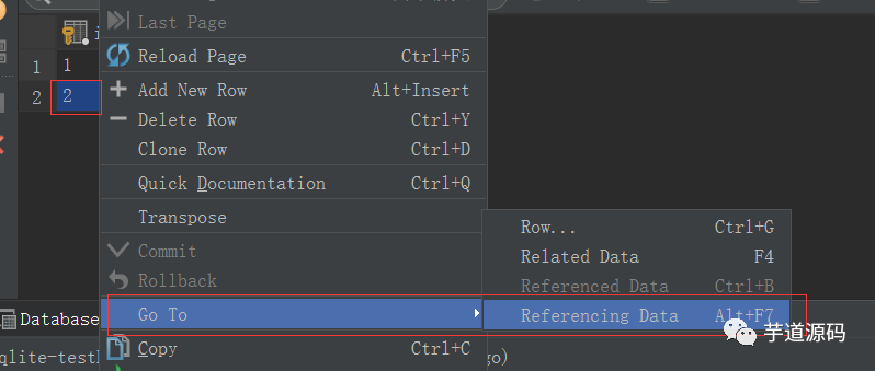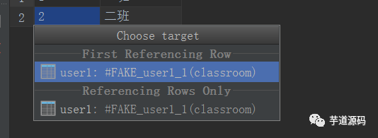 表之间会有外检关联,查询的时候,能直接定位到关联数据,或者被关联数据,例如user1表有个外检字段classroom指向classroom表的主键id,在查询classroom表数据的时候,可以在id字段上右键,go to,referencing data