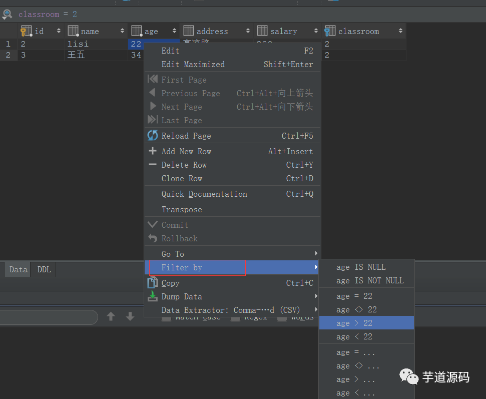对于使用table edit(对象树中选中表,右键->table editor)打开的结果集,可以使用条件继续过滤结果集,如下图所示,可以在结果集左上角输入框中输入where条件过滤