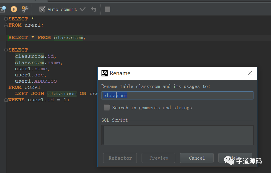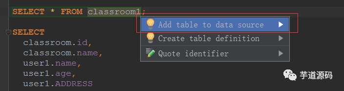 如果表名、字段名不存在,datagrip会自动提示,此时对着有问题的表名或字段名,按下Alt+Enter,会自动提示是否创建表或添加字段