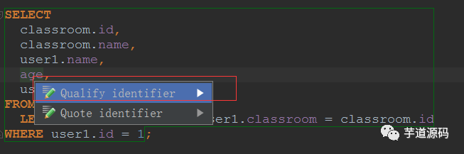 对于查询使用表别名的,而字段中没有使用别名前缀的,datagrip能自动添加前缀,鼠标停留在需要添加别名前缀的字段上,使用Alt+Enter快捷键