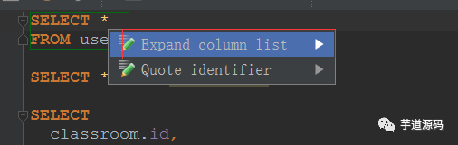 查询的时候我们会使用select 查询所有列,这是不好的习惯,datagrip能快速展开列,光标定位到后面,按下Alt+Enter快捷键