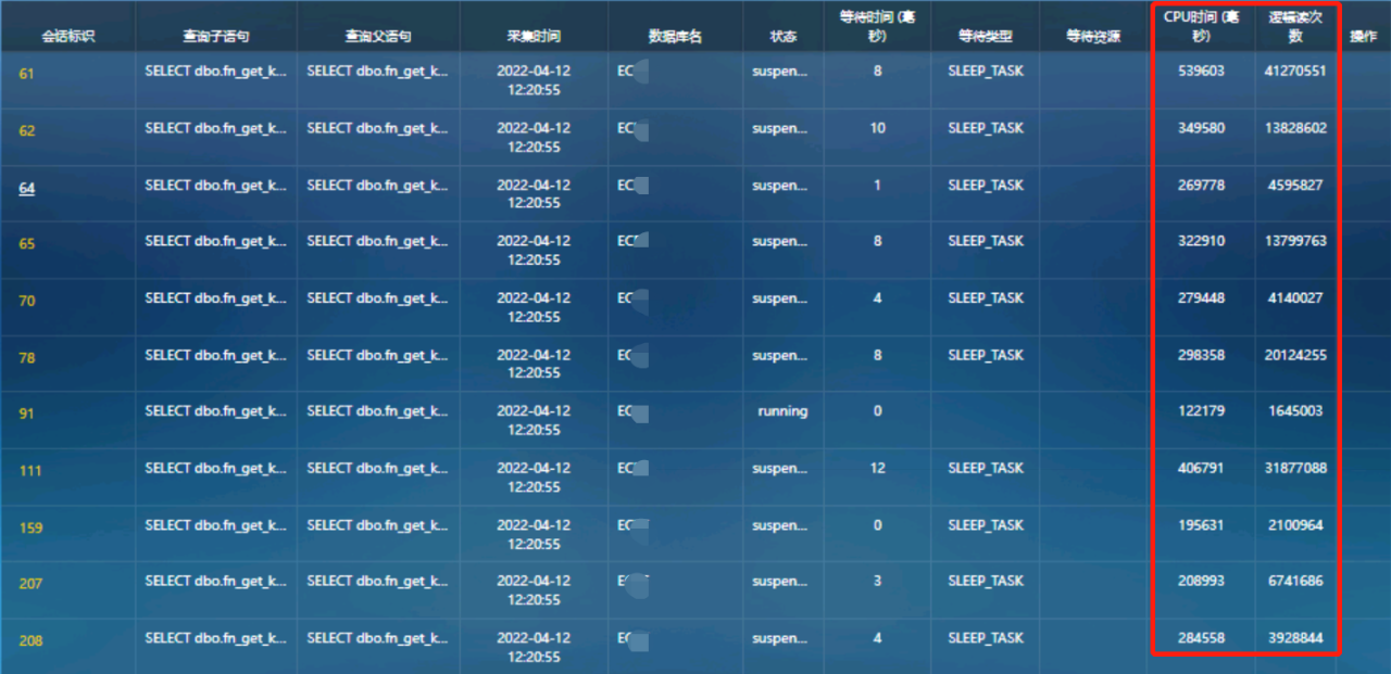 在活动会话页面看到对应时间段内在运行很多个消耗大、运行时间长的语句。