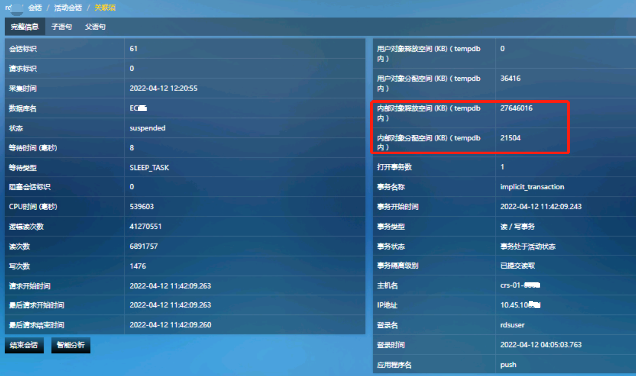 进入ID为61的会话完整信息,可以看到该会话内部对象释放空间达到了27G左右。是集团报表产生的查询语句,十分复杂,里面用到了大量的jion、union、order by、子查询等,都会消耗tempdb的内部对象空间。其他的会话也是相同的语句。