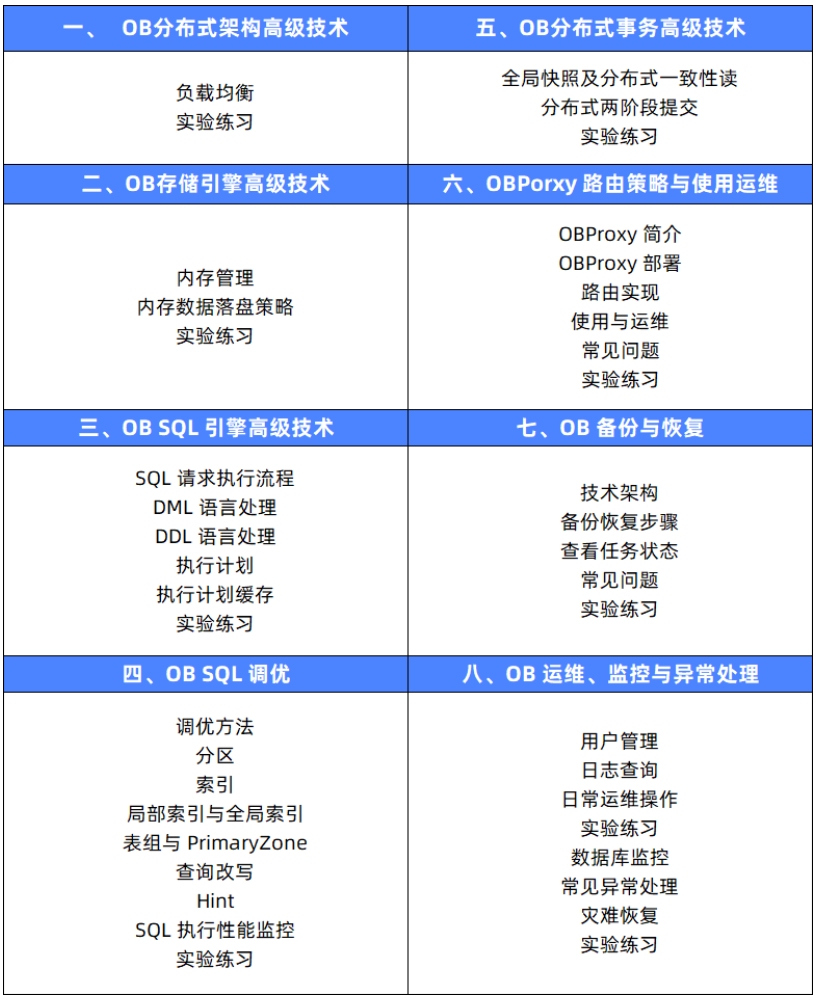 为了让大家更好的学习 OceanBase 的产品和技术,早日融入 OceanBase 技术生态体系,OceanBase 学院面向生态用户提供一站式学习成长平台,由 OceanBase 资深技术专家团队从理论到实践,全面帮助学员制定了系列化的培训认证课程,让您更好的理解 OceanBase 产品的核心特性,由浅入深的学习,一步步成长为 OceanBase 数据库专家!