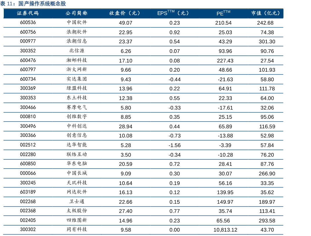 预计大型头部央企的信创招标或将树立标杆效应,带动行业内公司加速进行信创工作。底层芯片的国产化替代预计将和上层的操作系统、数据库等基础软件配合使用,带动整个信创产业链需求放量。