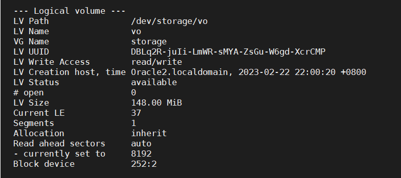 1.lvcreate -n vo -l 37 storage 创建逻辑卷vo