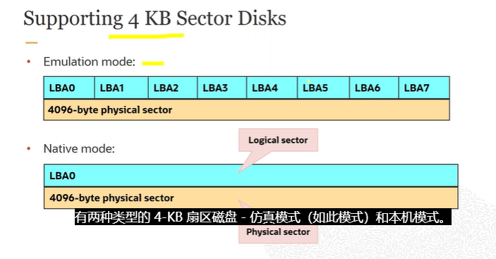 Native mode:即 4k 模式,物理和逻辑的 block 大小一样,都是 4096bytes。 Native mode 的缺点是需要操作系统和软件(如 DB)的支持。Oracle 从 11gR2 开始支持 4k IO 操作。 Linux 内核在 2.6.32 之后也开始支持 4k IO 操作。