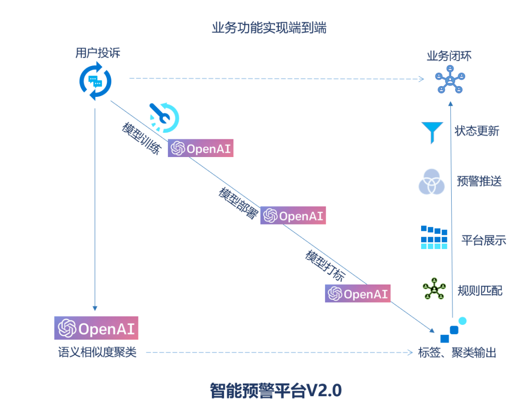 整个预警过程中,建立了持续反馈、智能学习的机制。随着模型标注数量的增加,模型训练的程度也会相应增加,为后续事件提高识别的准确率。 实现从业务中产生数据、数据回馈业务的一条端到端的完整闭环流程。
