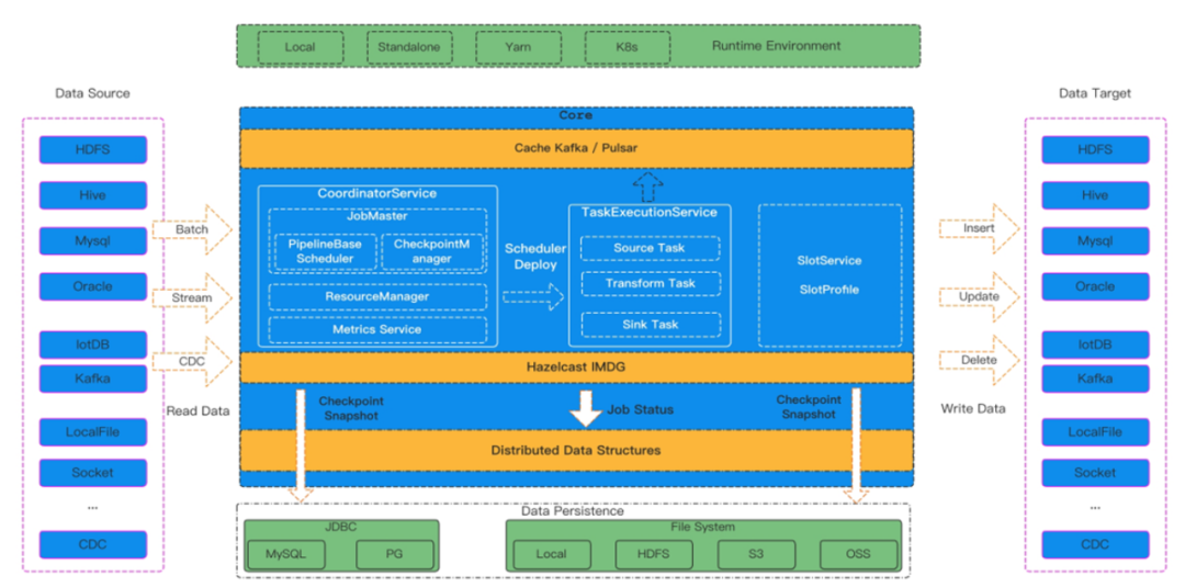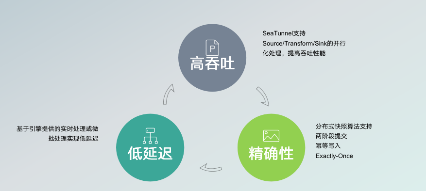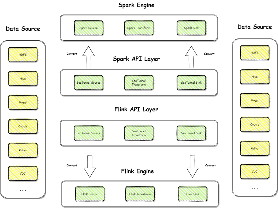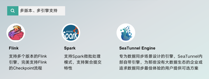简单易用,无需开发:SeaTunnel 做数据集成无需开发,只需要写入配置文件和配置项,即可快速生成一个数据同步任务; 批流一体架构:既支持批任务,又支持流任务; 异构多数据源支持:包括 HDFS、MySQL、Oracle、IoTDB 等,支持多异构数据源之间同步 支持Spark2.4.X+、Flink1.13.X:不仅有自己的计算引擎 Zeta,也支持 Spark2.4.X+、Flink1.13.X 版本,企业内部使用这些引擎可以无缝接入 SeaTunnel; 模块化和插件化,易于扩展:预留了丰富的接口更好地处理数据请求; 自研计算引擎,减少部署成本:自研计算引擎 Zeta,2.3.0 版本中有了很大的改进,保证稳定性和性能,系统在 Java 环境下可以直接部署,减少部署成本; 支持CDC:无缝接入 CDC,目前支持的 CDC数据源包括 MySQL、SQLServer 等。