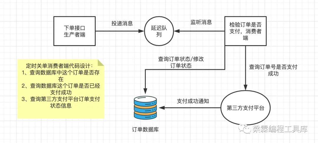 消费者相当于定时任务,当延迟消息被消费者监听到的时候,就会检查这笔订单是否支付成功,如果没有支付,则进行关单。