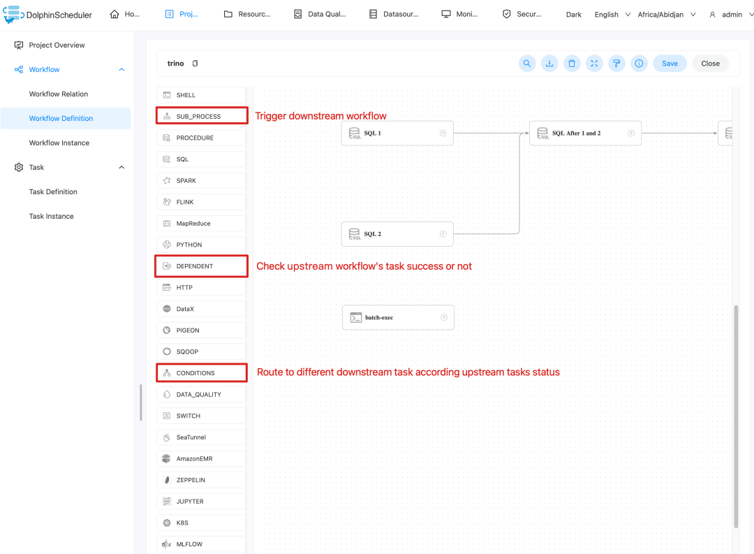 在面对联合查询和湖仓一体场景时,Trino 已经是不少开发者的不二之选。Trino 是一个查询引擎,在数仓、即席查询方面非常强大。然而,在整个数仓处理场景中,相信很多数仓用户关注的不仅是查询,还有应用层面的可视化编辑 SQL 能力、失败重试、任务并发控制、SQL 版本管理、任务编排等能力,但这些 Trino 还未提供。幸运地是,Apache DolphinScheduler 作为一个工作流调度平台,最擅长的就是提供这样的能力。如果两者相结合,就可以互相取长补短,补足彼此的能力。