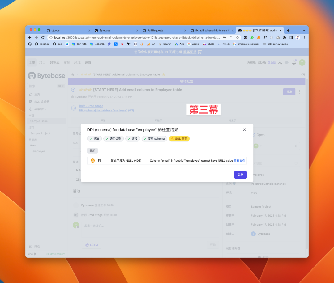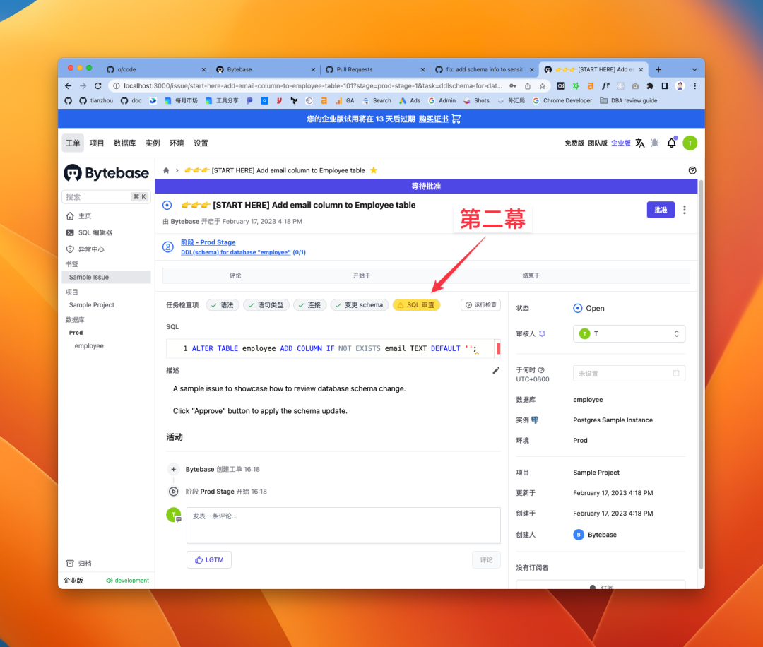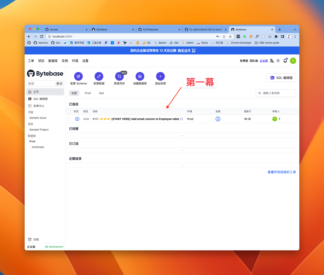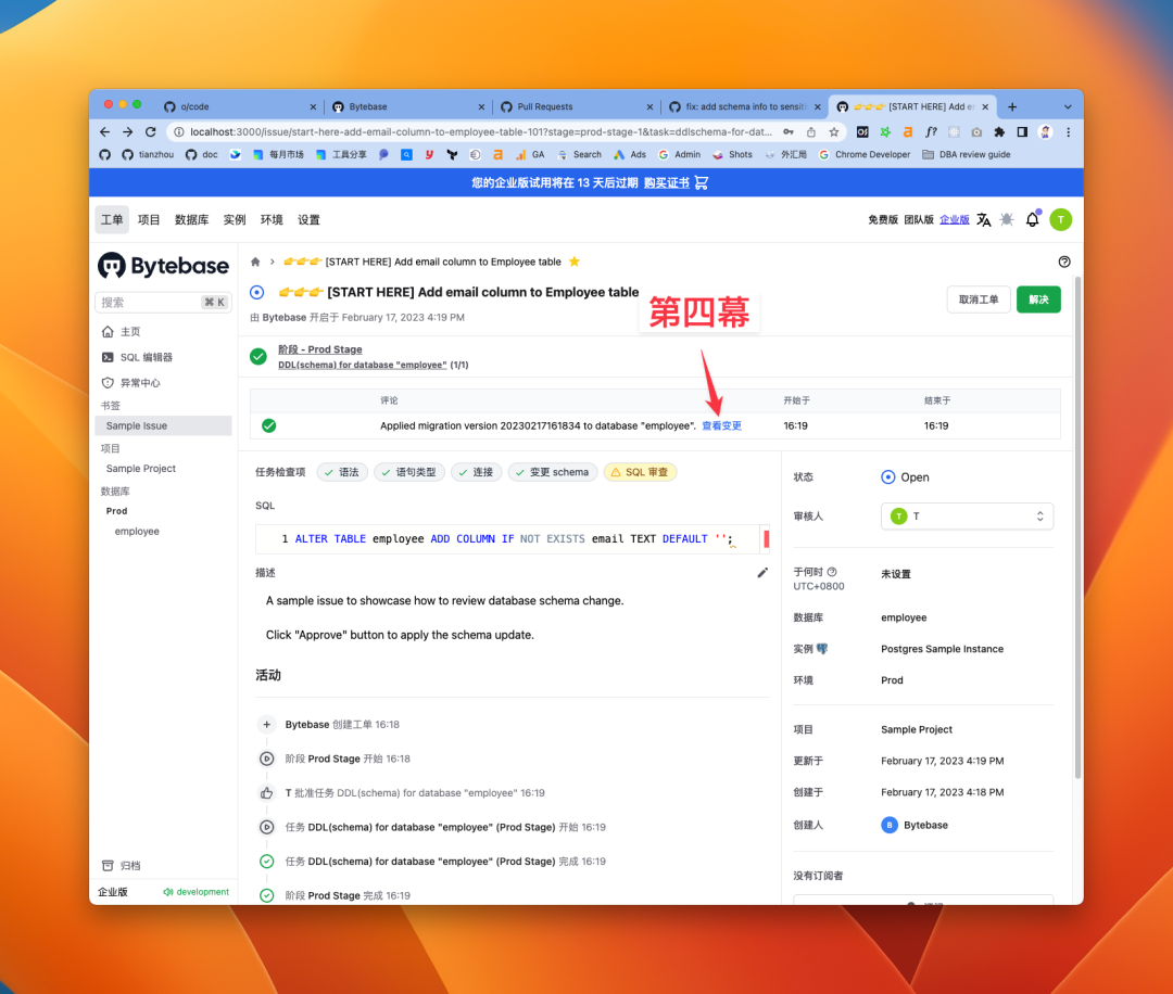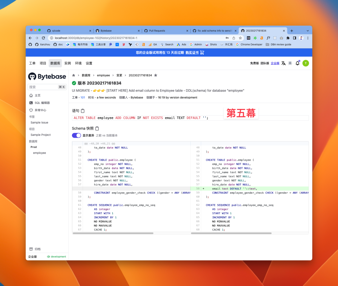 最后再说说上手教程的优化,这是第二版,之前的一版是强制用户需要完成上手教程。在上手过程中需要用户添加数据库实例,如果添加失败的话,再弹出是否要创建 Sample 实例的对话框。接着还要创建项目,转移数据库到项目里,才能开始做变更。整个流程前戏太长,所以这次调整成预先配置好了整个的实例和项目环境,用户一注册,就能立马体验到 Bytebase 的两大核心能力,变更和查询的一体化: