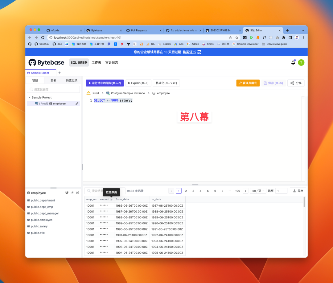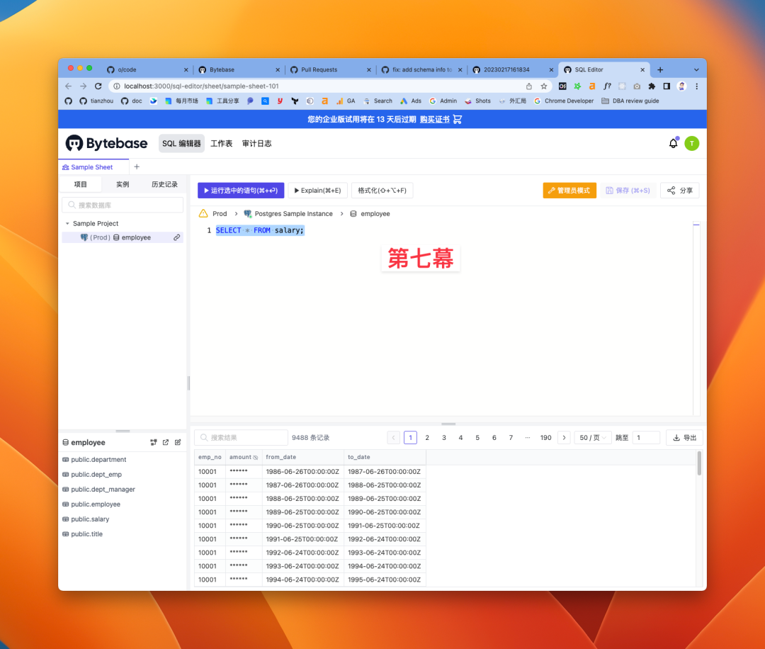 从变更流程,体验到整个审核协同工作流,以及预先配置的 SQL Review 自动审核策略;变更完成后的变更历史信息。 然后进入到 SQL Editor,也是配置好了查询语句和脱敏字段,既能体验到快速查询数据的快感,也能感知到字段脱敏的数据安全功能。
