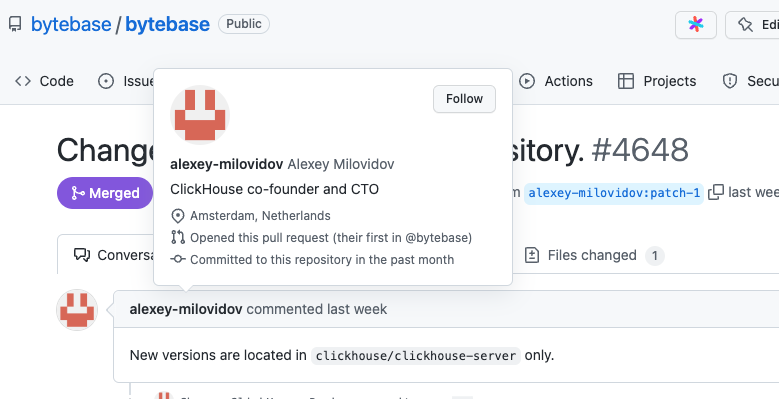 另外这次的发布周期,我们还官宣了和 GitHub 以及 PingCAP 的技术合作,接下来会继续和行业里更多优秀的同行建立起产品方案的集成。Bytebase 占的坑位还是不错的,能和各方集成,形成 1 + 1 > 2 的效果。这周 ClickHouse CTO 还跑到我们仓库来贡献了个 PR,改天也去给他们贡献个 PR,他们的 go-driver 改进的空间还很大呀。