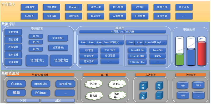 1、GreatADM可做到对底层IaaS层的软硬件、操作系统、云厂商环境、芯片存储等最小差异化或无差异的识别部署,降低基础环境的敏感度和国产化项目交付中兼容适配的难题,减轻DBA运维压力;