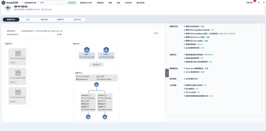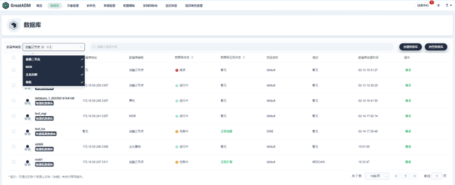 3、GreatADM支持高可用容灾部署和平台横向性能扩展,实际管理的数据库节点能力在数百到数千节点量级。且支持物理主机的复用部署及主机资源池化分配,在最大程度上发挥主机性能,降低客户硬件成本。