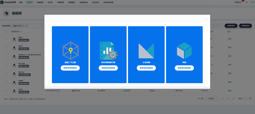 2、GreatADM自身简单、易用、容器化的部署,轻量且无外部依赖,支持万里安全数据库分布式、集中式等多种数据库方案的同时,还兼顾用户MySQL现有业务的统管,解决项目新旧更替业务遗留实例无法管理的情况;