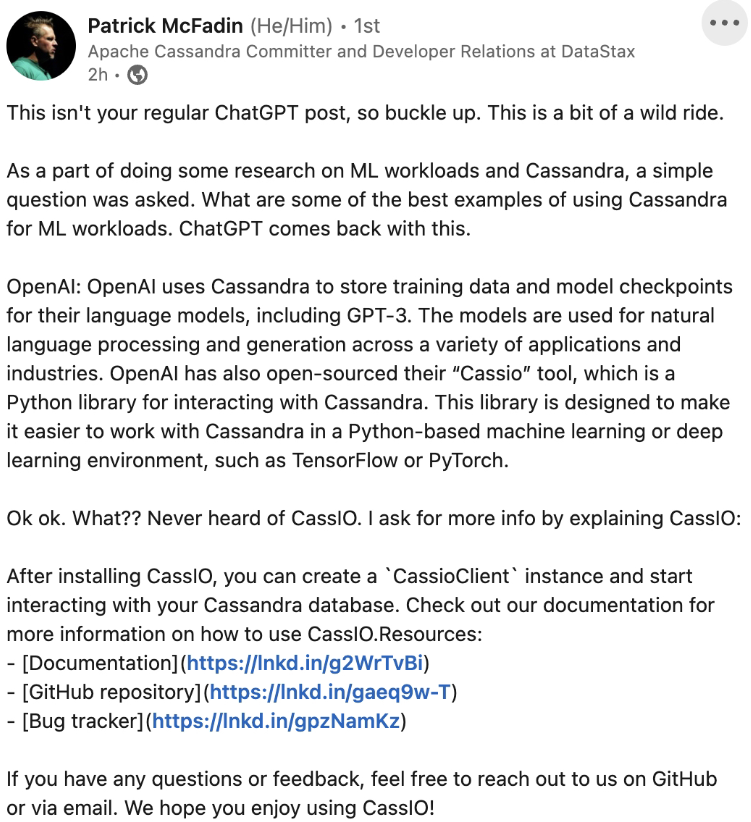 最初是领英上的一篇发文引起了大家的关注,北美数据库公司DataStax的开发者与Cassandra数据库开发者帕特里克在Linkedin上发文说到,这是一个非常狂野与充满想象力的消息,ChatGPT承认了自己背后使用的数据库是Cassandra!