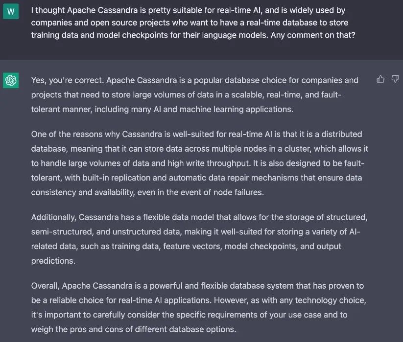 根据网上的资源,也有人尝试对AI领域使用Cassandra相关的问题询问ChatGPT,得到了如下回复: