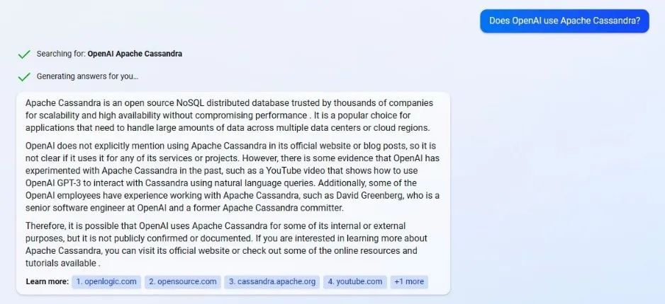有资源的相关人士,通过正在内测的新必应,尝试问出OpenAI使用Cassandra的真相。新必应内置增强版的ChatGPT,其对于对话内容获取与问题解答的能力相较于公开版更为强大。在这里我们直接拷问新必应OpenAI是否使用了阿帕奇Cassandra数据库。