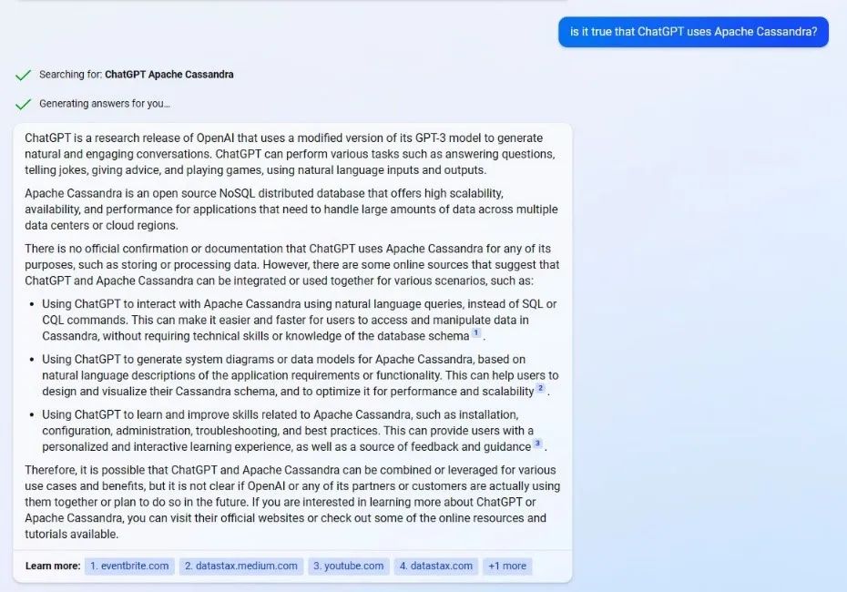 新必应的回答先是夸赞了Cassandra一番,随后也没有直接肯定OpenAI使用了Cassandra数据库,但是也提供了一些OpenAI历史上可能应用过这一数据库的证据。同时我们看到,回答中显示有油管视频展示了如何使用GPT-3来操作这一数据库,OpenAI的高级工程师David Greenbery也曾是阿帕奇基金会下Cassandra项目的代码提交者。当然,这一回答并不能满足我们对于OpenAI是否使用了Cassandra的疑问,所以我们更加直接地追问新必应,ChatGPT是否真的使用了Cassandra数据库。