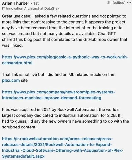DataStax的员工在更深入的探索与交互中,发现ChatGPT提供了更多不存在的链接。这一证据也可能表明相关应用证据和工具链曾经存在于网络上,只是已经被移除了,但是非常多的证据可能还散布在网络上。世界上最大的工业自动化公司之一Rockwell Automation也曾发文介绍AI在工业需求预测上的应用。这么多关于OpenAI把Cassandra应用于AI领域的消息,十分明确地指明了这一可能的应用方向与相关前景。至此,我们可以相信,即使OpenAI没有公开承认其使用的技术栈与数据库,Cassandra也有相当的概率已经被其应用于相关服务。