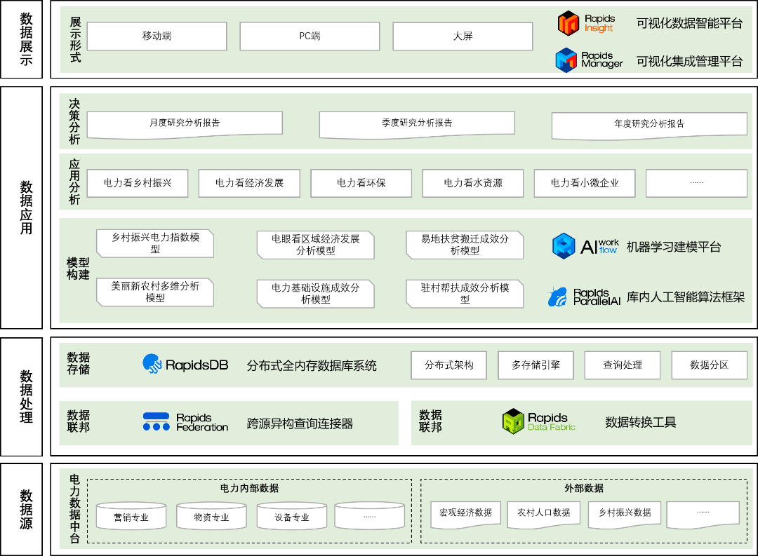 依托自主研发的分布式内存数据库RapidsDB、机器学习建模平台AIworkflow、可视化数据智能平台RapidsInsight及跨源异构查询连接器Rapids Federation等技术产品,柏睿数据以电力数据为核心,融合外部数据,打通电力内外部数据交互通道,深挖电力数据社会化应用价值,为国家电网省级电力公司打造“电力大数据多方协同应用价值挖掘解决方案”,包括数据源、数据处理、数据应用、数据展示四层设计结构,能够高效完成对海量电力数据的实时查询计算,紧密结合业务需求构建电力大数据分析模型和分析场景,精准输出决策分析报告,持续为乡村数字化治理和乡村振兴工作的开展提供优质高效、精准可靠的大数据服务和科学决策依据。