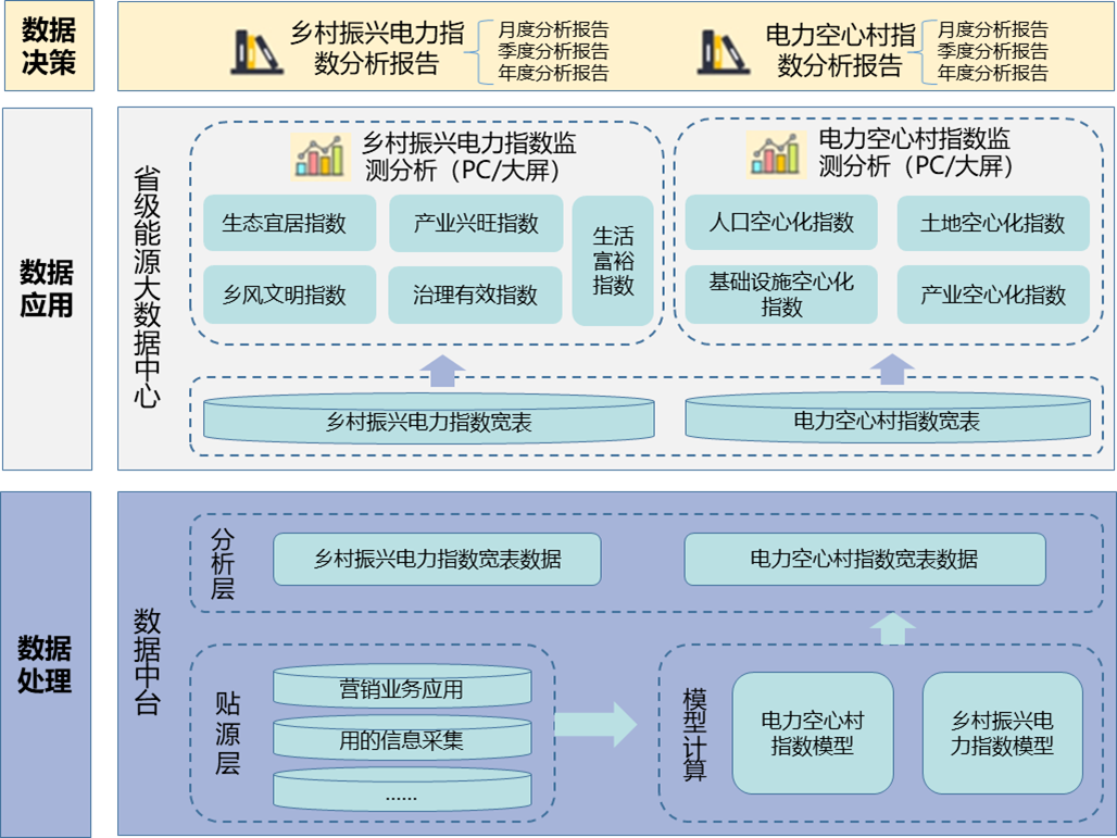 基于柏睿数据“电力大数据多方协同应用价值挖掘解决方案”,以电力数据为核心,融合外部数据,充分挖掘电力大数据价值,设计构建乡村振兴评价体系,以电力视角对乡村振兴发展评价;借助大数据技术构建乡村振兴电力指数,全方位评价乡村振兴建设成效,实时反映全省乡村经济总体状态,评估乡村经济政策,精准衡量政策效应,辅助乡村振兴政策精准制定,服务政府提高社会治理能力和管理水平。借助可视化技术构建乡村振兴大数据监测分析场景,直观展示各区域乡村振兴电力发展指数水平。