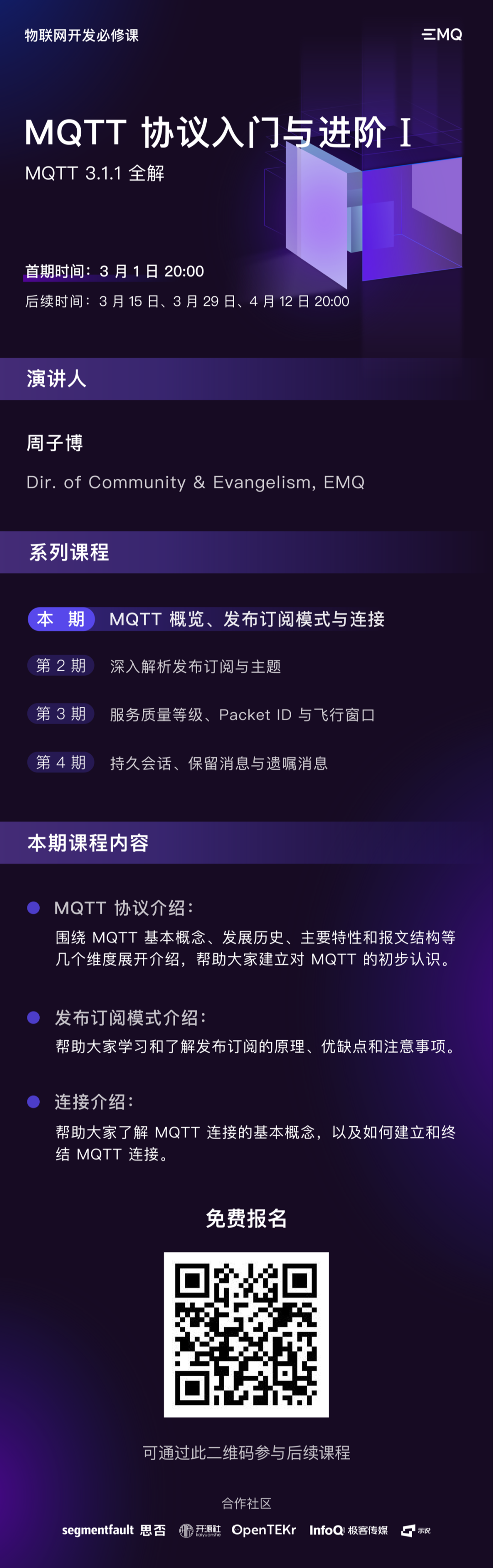 3 月 1 日 20:00 率先开课的「3.1.1 版本讲解」,将从 MQTT 协议的基础概念和原理讲起,用四期课程带你全面了解 MQTT 3.1.1。