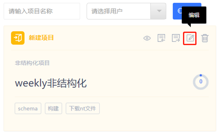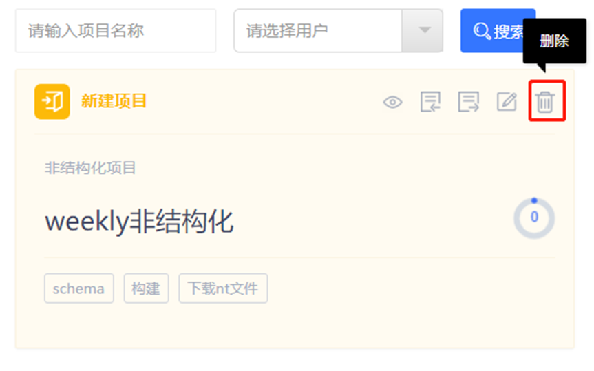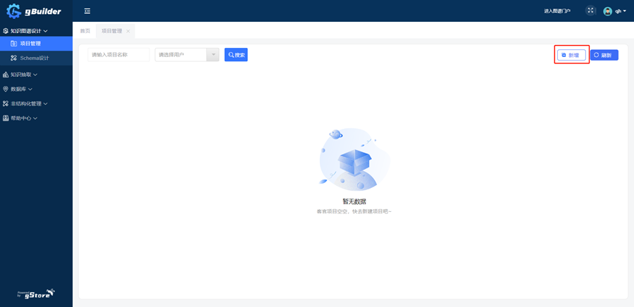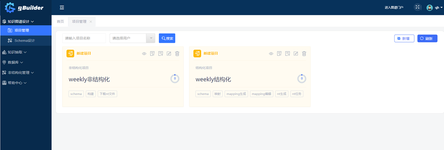 我们以项目的方式进行知识图谱的构建进行管理,每个知识图谱的构建任务都是一个项目,因此项目管理功能是使用gBuilder进行知识图谱构建的开端。