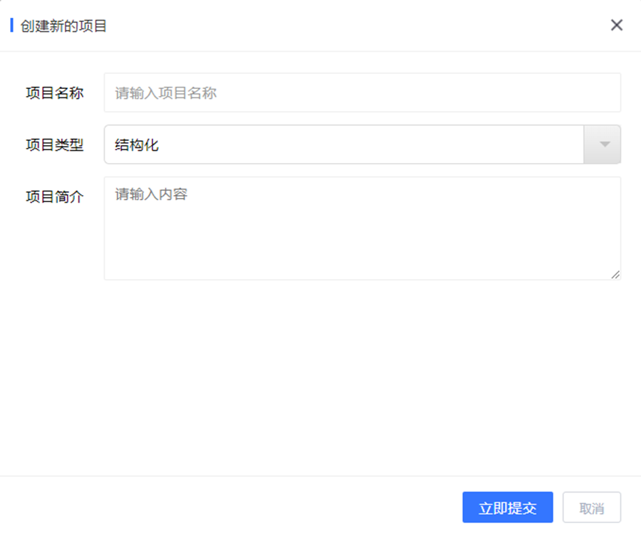 填入要创建项目的名称和简介,其中项目类型可根据实际情况选择【结构化】、【非结构化】项目,结构化和非结构化具体是指当前用来构建知识图谱项目的数据类型,并可输入项目简介信息。