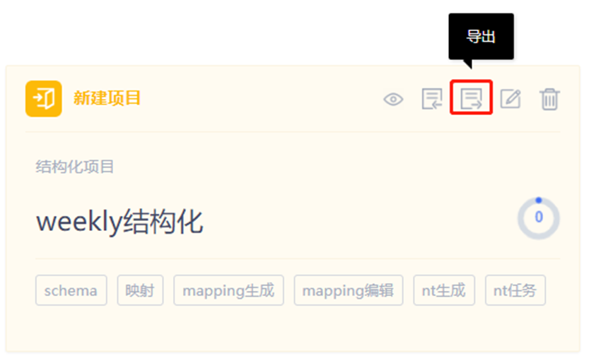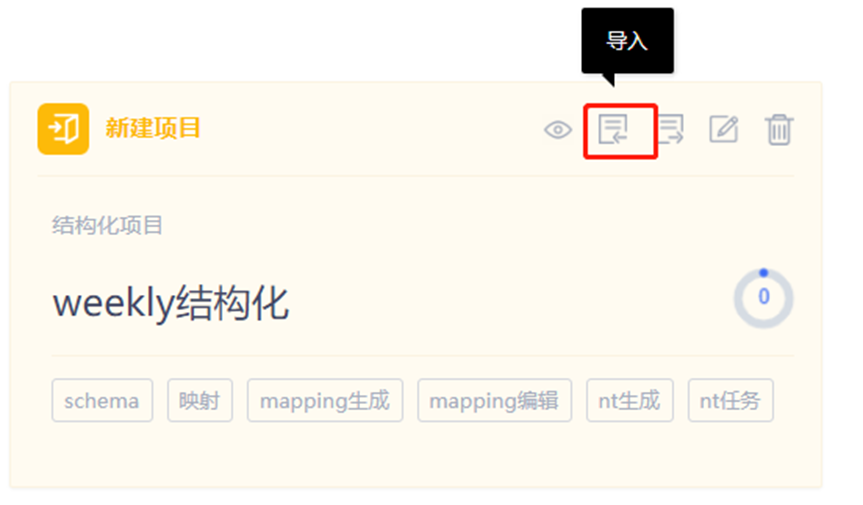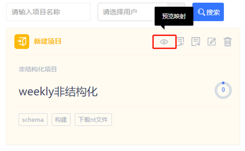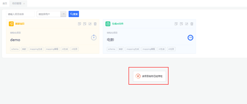 对于结构化项目在项目管理卡片下面有schema、映射、mapping生成、mapping编辑、nt生成、nt任务6个功能按钮进行对应操作。而非结构化项目在项目管理卡片下面只有schema、构建、下载nt文件3个功能按钮。在构建知识图谱项目时,项目名称需要保证唯一性,在项目名称重复时系统会提示该项目名称已存在的消息。同时项目管理卡片有进度展示,可以展示当前知识图谱构建的整体进度情况,以百分比的形式进行展示。