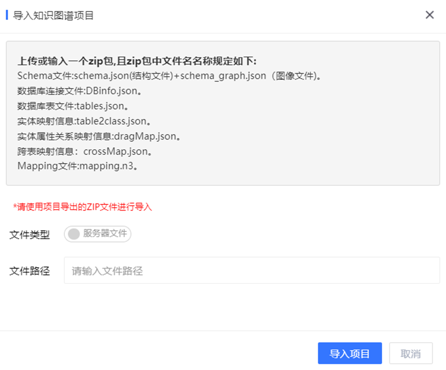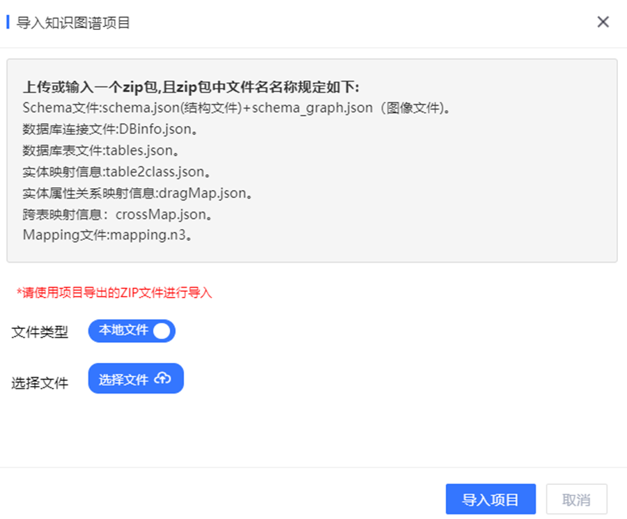 用户若之前已经有构建好的知识图谱项目,包括schema、数据库连接信息、实体映射信息、属性关系映射信息等文件。用户可以从服务器和本地导入文件,导入的文件需要为一个压缩包,并且每个文件的命名要符合规范。