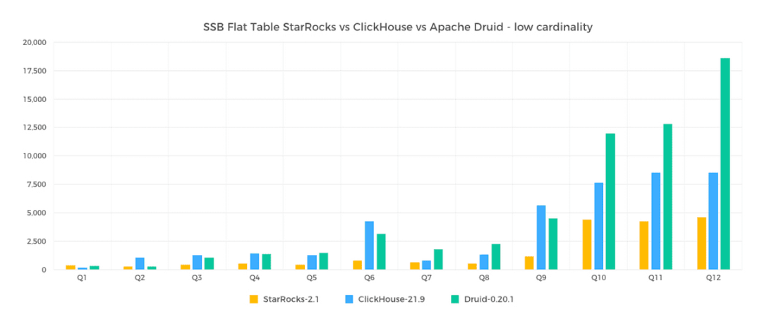 我们主要对 ClickHouse 和 StarRocks 的查询性能做了对比,在 SSB 单表和用户经常碰到的低基数聚合场景下对比了 StarRocks 和 ClickHouse 的性能指标。采用一组 16core 64GB 内存的云主机,在 6 亿行的数据规模进行测试。