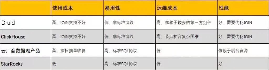 除了查询性能,我们从使用成本、易用性、运维成本等方面,对比了几款比较热门的产品,最终我们计划将基于 ClickHouse 等其他数据库产品的查询迁移到基于 StarRocks 来构建数据仓库。