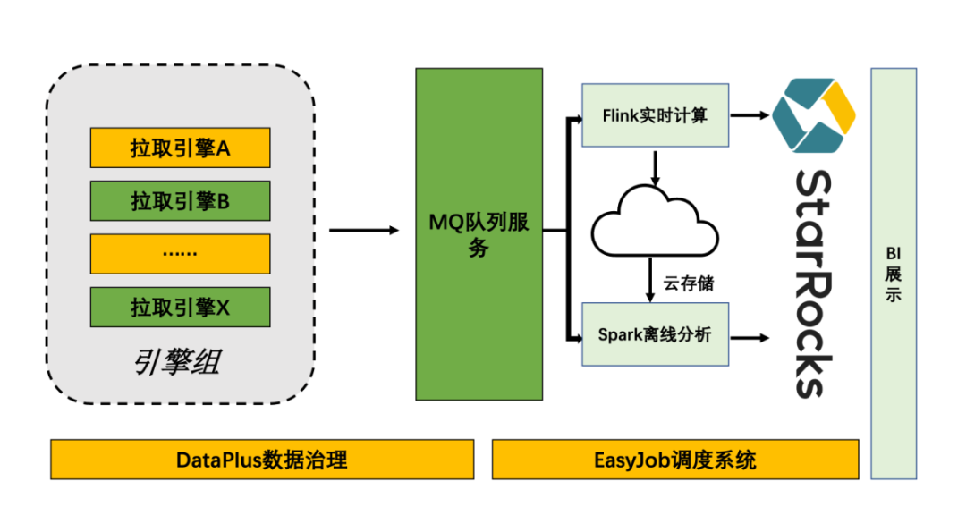 数据平台目前处理的数据涉及公司多个产品,每日处理全球增量数据几十T,近千亿条记录,跨云跨地域的数据也给数据处理带来不少挑战。目前我们已经针对 BI 系统开展了基于 StarRocks 的数据仓库的建设,随着经验的积累,后期会推广到数据平台所有项目的数据场景中。目前数据平台以实时流和离线处理两条方式同时向 StarRocks 数据仓库中进行数据 Load 。下图是目前数据平台在数据分析中的主要流程架构,如图所示,架构中我们自研了数据治理平台(DataPlus)用于数据监控提高数据质量, 维护元数据血缘等数据的拓扑结构,自动化建模。另外我们还自研了分布式的跨云调度系统(EasyJob),用于系统便捷的处理多云环境下的数据依赖和调度。