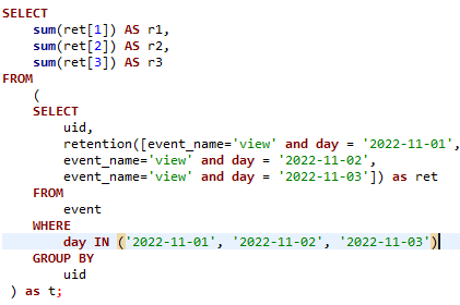 统一的模型 SQL 设计,高阶函数的应用,可以提高查询性能50%以上。例如我们主要针对下面三种常见分析模型设计了标准建模 SQL ,未来将通过此标准自动建模,提升查询效率。对于用户留存的分析,经常会在多个条件下获取用户的行为状态,我们采用了 retention 函数来分析,大幅提升了查询分析的效率。例如:要清楚的了解 event=view 并且时间在2022-11-01、2022-11-02、2022-11-03条件下的用户情况;传统的方式需先进行 event=view and date='**--**' 条件判断,然后进行合并,但是 retention 函数的出现直接简化了相应的建模过程,通过 retention 函数,可以直接获取 event=view 以及三个日期条件下的行为,并且以数组的形式进行展示,之后可以通过对数组的聚合操作,进行相应的行为分析。