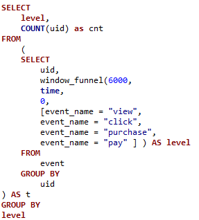 如上图 SQL ,可以计算在规定时间窗口内,用户在 view/click/purchase/pay 连续行为下的相关数据,最终返回不同的连续行为级别下对应的用户数量。针对用户前后行为路径分析场景,例如需要针对用户前后行为进行对比分析的场景,可以综合考虑采用 StarRocks 支持的ROW_NUMBER(),LEAD(),LAG()
