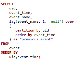 等窗口函数进行建模分析。如下是一个针对用户前后行为分析的具体案例,可以针对用户的 event 以及前置 event 进行展示: