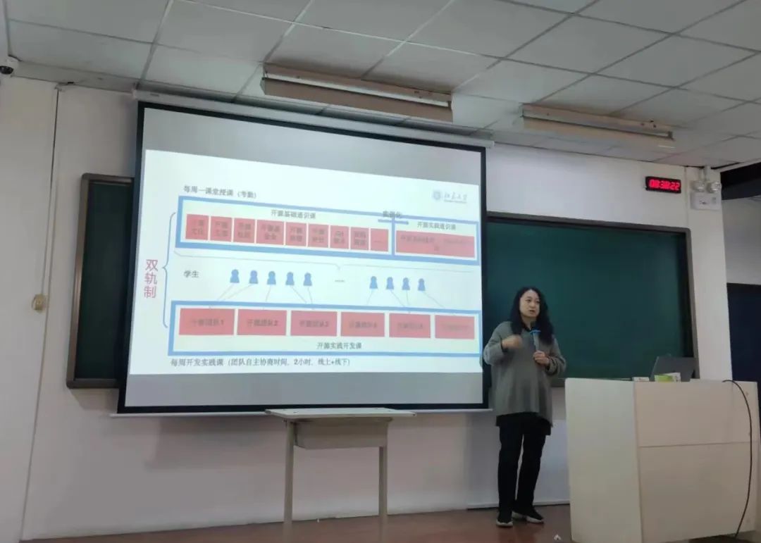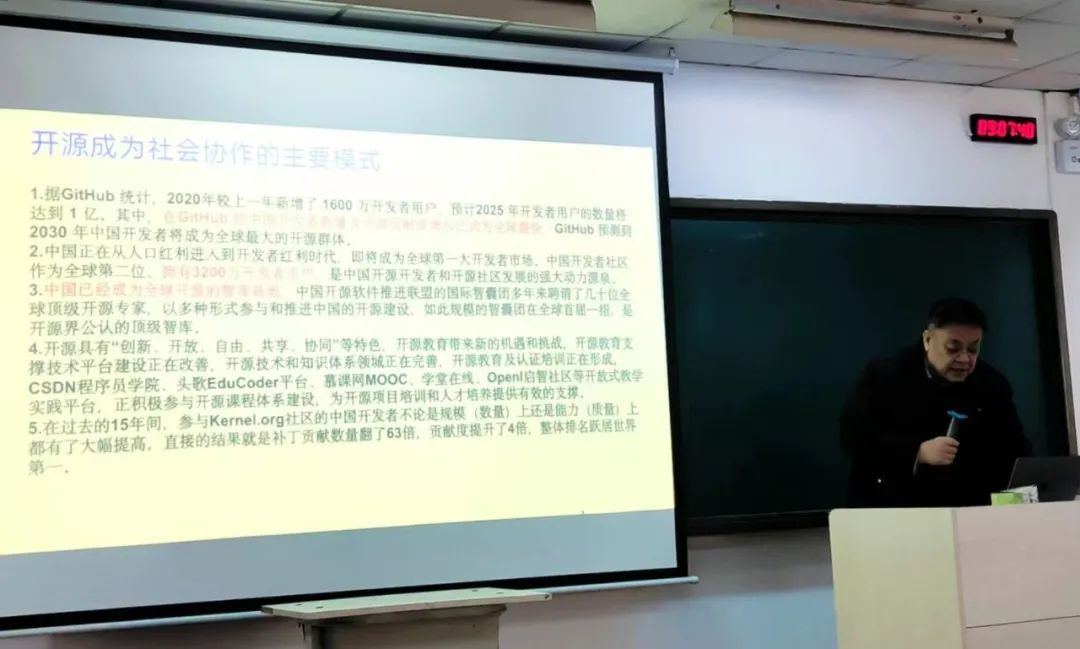 本次开课宣讲会有幸邀请到中国开源软件推进联盟刘澎副主席为大家做开题报告,课上刘主席分享了中国开源新趋势、新形态,开源已然成为社会协作的主要形式。