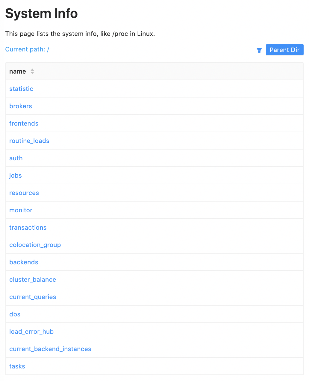 mysql> show proc "/";+---------------------------+| name |+---------------------------+| statistic || brokers || frontends || routine_loads || auth || jobs || resources || monitor || transactions || colocation_group || backends || cluster_balance || current_queries || dbs || load_error_hub || current_backend_instances || tasks |+---------------------------+17 rows in set (0.00 sec)mysql> show proc "/dbs";+-------+------------------------------------+----------+-------------+--------------------------+--------------+| DbId | DbName | TableNum | Quota | LastConsistencyCheckTime | ReplicaQuota |+-------+------------------------------------+----------+-------------+--------------------------+--------------+| 0 | default_cluster:information_schema | 17 | 1024.000 GB | NULL | 1073741824 || 10003 | default_cluster:db1 | 3 | 1024.000 GB | NULL | 1073741824 || 10013 | default_cluster:doris_audit_db__ | 1 | 1024.000 GB | NULL | 1073741824 |+-------+------------------------------------+----------+-------------+--------------------------+--------------+3 rows in set (0.00 sec)