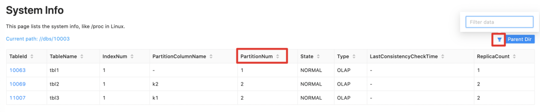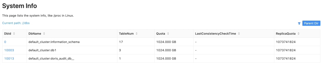 mysql> show proc "/dbs";+-------+------------------------------------+----------+-------------+--------------------------+--------------+| DbId | DbName | TableNum | Quota | LastConsistencyCheckTime | ReplicaQuota |+-------+------------------------------------+----------+-------------+--------------------------+--------------+| 0 | default_cluster:information_schema | 17 | 1024.000 GB | NULL | 1073741824 || 10003 | default_cluster:db1 | 3 | 1024.000 GB | NULL | 1073741824 || 10013 | default_cluster:doris_audit_db__ | 1 | 1024.000 GB | NULL | 1073741824 |+-------+------------------------------------+----------+-------------+--------------------------+--------------+3 rows in set (0.00 sec)mysql> show proc "/dbs/10003";+---------+-----------+----------+---------------------+--------------+--------+------+--------------------------+--------------+| TableId | TableName | IndexNum | PartitionColumnName | PartitionNum | State | Type | LastConsistencyCheckTime | ReplicaCount |+---------+-----------+----------+---------------------+--------------+--------+------+--------------------------+--------------+| 10063 | tbl1 | 1 | NULL | 1 | NORMAL | OLAP | NULL | 1 || 10069 | tbl2 | 1 | k2 | 2 | NORMAL | OLAP | NULL | 2 || 11007 | tbl3 | 1 | k1 | 2 | NORMAL | OLAP | NULL | 2 |+---------+-----------+----------+---------------------+--------------+--------+------+--------------------------+--------------+3 rows in set (0.00 sec)