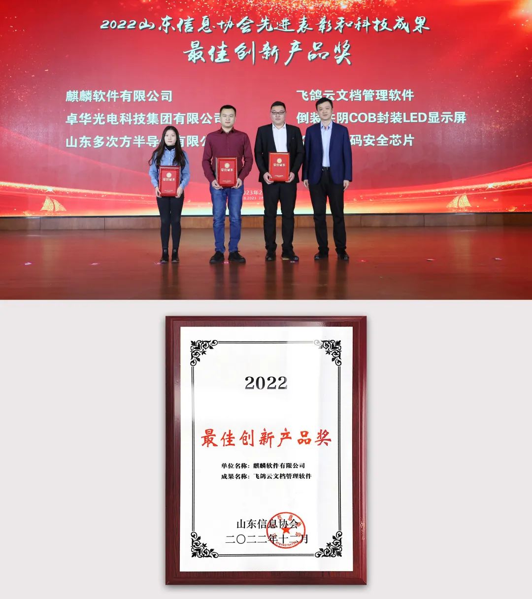 近日,山东信息协会2022年度协会年会暨“网络安全与信息化论坛”成功召开。本次论坛由山东省委网信办、省发展改革委、省大数据局、省国家保密局、省密码管理局指导,山东信息协会主办。会议期间,2022年度协会工作和信息化科技成果奖评选结果重磅揭晓。麒麟软件荣获“2022年度领军企业”,旗下“飞鸽云文档管理软件”荣获“2022年度最佳创新产品”奖。来自省网络安全和信息化主管部门领导,协会特邀顾问及协会智库专家、协会会员单位代表等200余人参加此次会议。